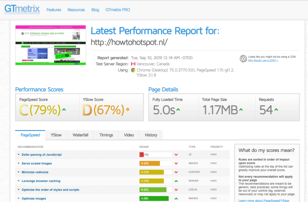 Het rapport van GTmetrix ziet er als volgt uit (ik kan nog wel wat verbeteren, zoals je ziet.