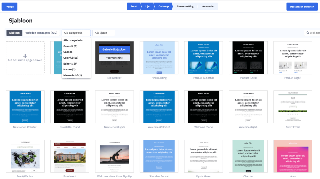 Een e-mail ofwel campagne genoemd, stel je samen met drag en drop. Je kan gebruik maken van aangeboden templates, maar je kan ook zelf een email(template) opbouwen. Pas de look en feel aan aan je huisstijl en voeg de content toe die je wil: tekst, afbeeldingen, video’s, social media buttons, enzovoort.