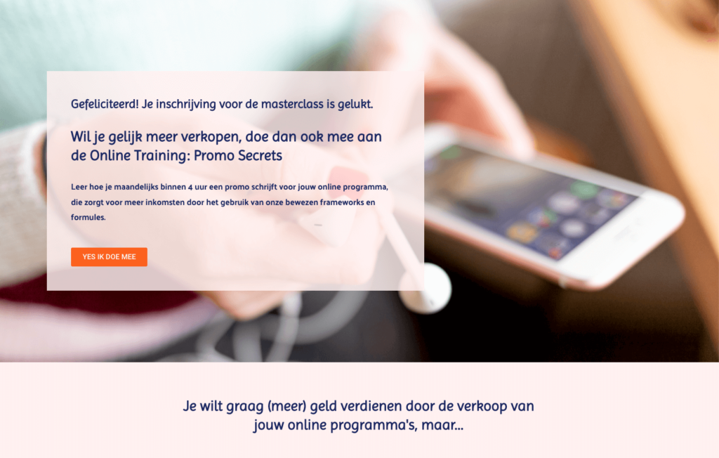 Zorg dat het past bij jouw aanbod en bij de bezoeker die iets bij je kocht. En maak het feest compleet met een korte video waarin je je aanmelder feliciteert met zijn of haar besluit. Als toevoeging nodig je hem of haar uit voor bijvoorbeeld een vervolgcursus, webinar of het delen van de freebie.