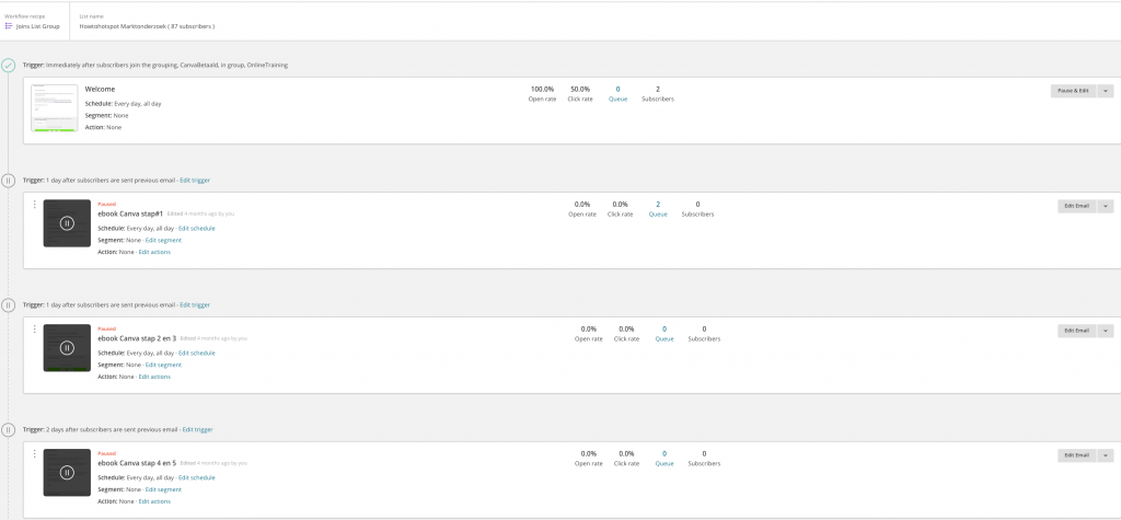 Mailchimp en Active Campaign geven je de mogelijkheid om geautomatiseerd emails te versturen na aanmelding op een lijst, toevoegen van een specifieke tag of na een bepaald actie van een contact in een gewone nieuwsbrief.