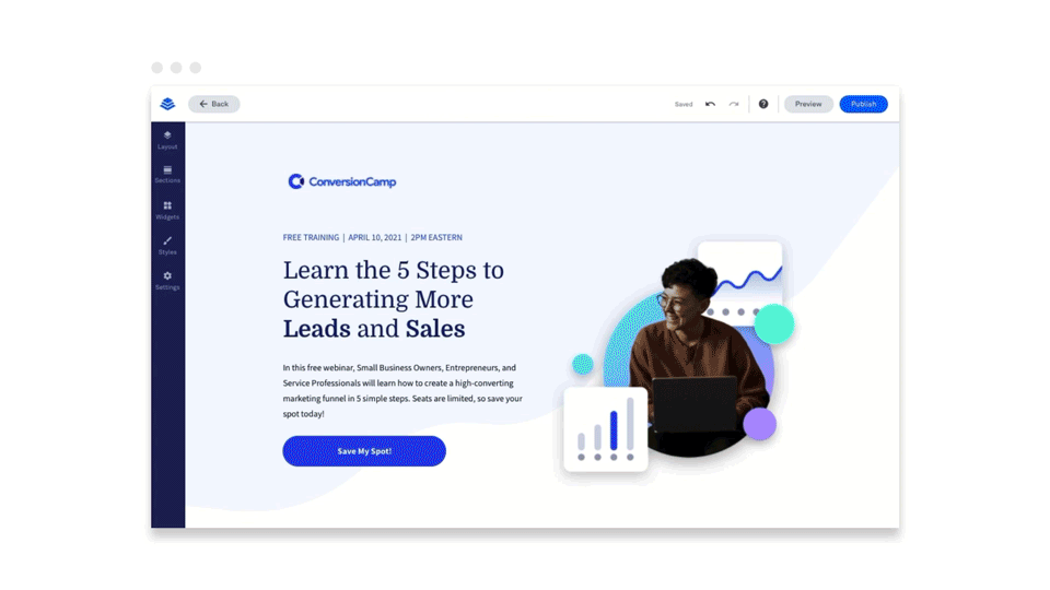 Leadpages biedt een drag en drop editor, waardoor je snel en eenvoudig elementen kunt toevoegen en verplaatsen. Geen ingewikkelde verborgen codes of onduidelijkheid over elementen.